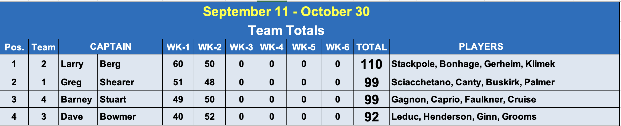 Larry’s team is still way out in front after posting his 19 last week. Greg and Barney’s teams are now tied for 2nd. Let’s see how long Larry’s team can hold on to their lead!