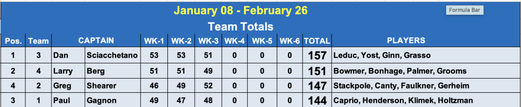 Week #3 of the Hickey Men’s Advanced League was kind of a weird one. I don’t recall ever seeing a week where all of the captains scored under “par”. But their teammates all picked up the slack so the order did not change that much. Greg’s team did move out of the basement to 3rd place. We’re just halfway thru the season so there’s still plenty of time for things to change up.