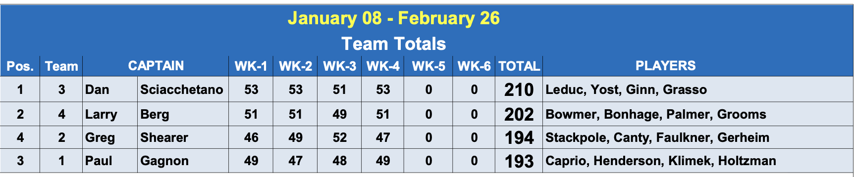 Week #4 of the Hickey Men’s Advanced League is in the books. Dan’s team extended their lead but the order is the same as last week and shown below.