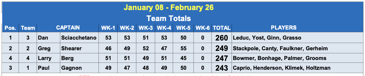 Week #5 of the Hickey Men’s Advanced League had a slight change in the order.   Dan’s team is still in 1st but Greg’s team slid into 2nd and knocked Larry’s team down to 3rd thanks to a really terrible performance on my part.