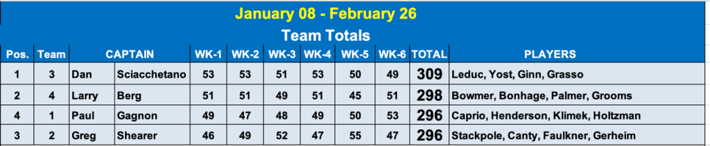 This season of the Hickey Men’s Advanced League ended in a tie for 3rd place – can’t remember the last time that happened.   Dan’s team finished in 1st and Larry’s team in 2nd, knocking Greg’s team into that tie with Paul’s team for 3rd – or last if you prefer!