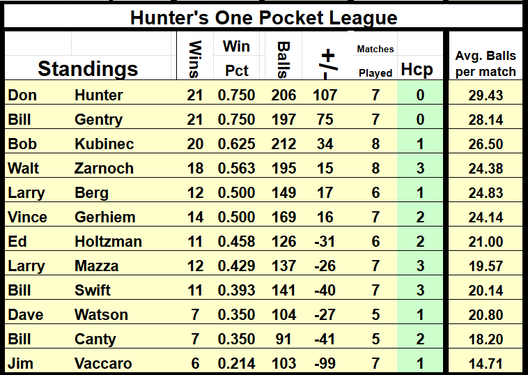 Looks like Bill Gentry got knocked out of 1st place by Don Hunter. Don and Bill are tied in Wins at 21 but Don has a higher # of Avg. Balls per match. Bob Kubinec is in 3rd with 20 wins. There are still a few make-up matches that could shuffle the order below…